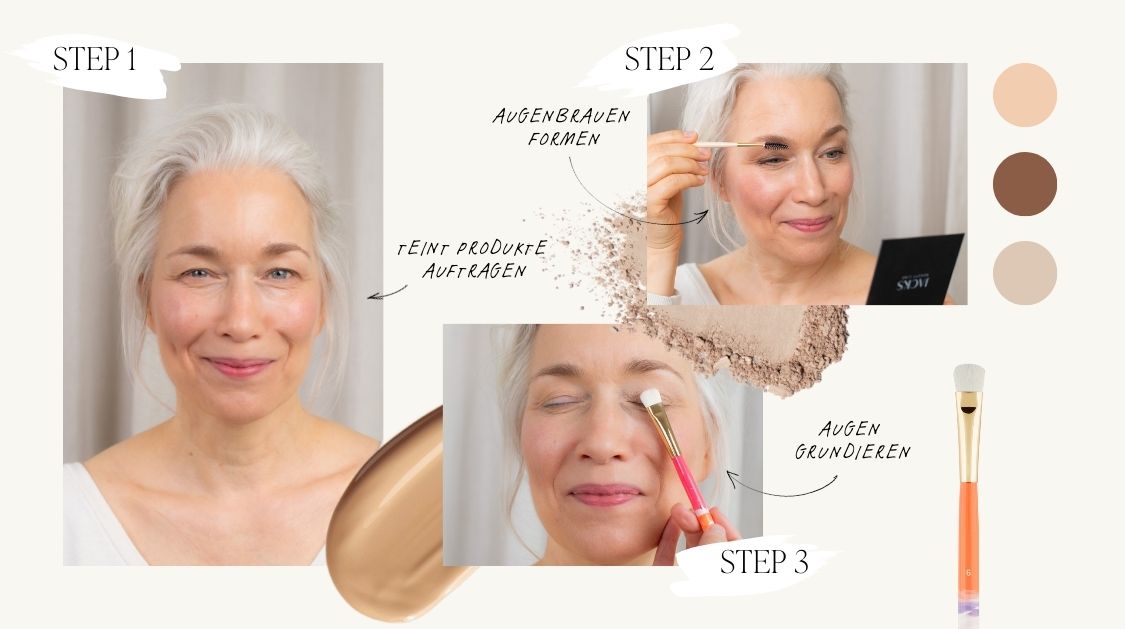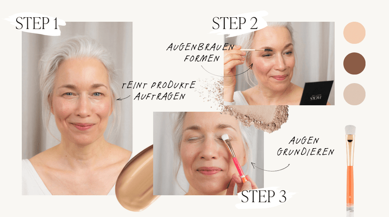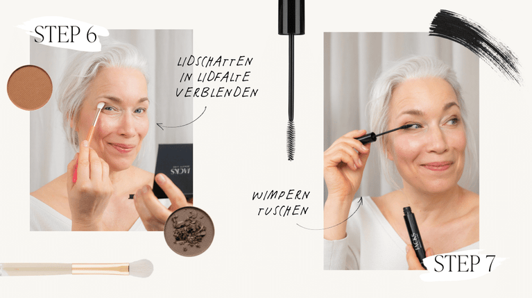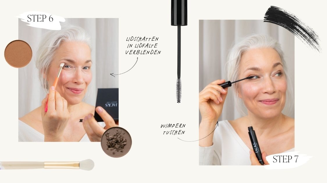 Verwende matte Lidschatten in neutralen Farbtönen, um die Augen zu betonen und die Schlupflider optisch zu korrigieren.