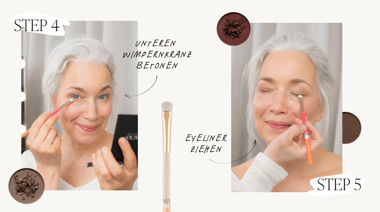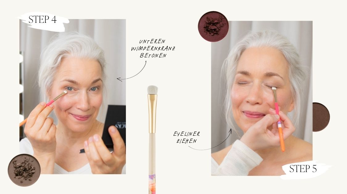 Lidschatten: Dark Brown, Pinsel: #3 Eyelinerpinsel für die angefeuchtete Variante. #5 Flacher Detailpinsel mit trockenem Lidschattenpuder. Gehe dabei mit stempelnden Bewegungen so nah wie möglich am Wimpernkranz entlang.