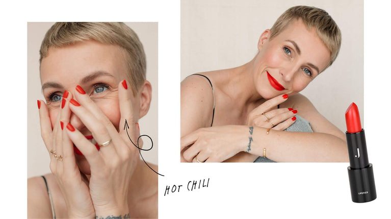 Trage unseren Lipstick Orange Red zunächst direkt auf deine Lippen auf und male sie anschließend mit unserem #15 Lippenpinsel nach.