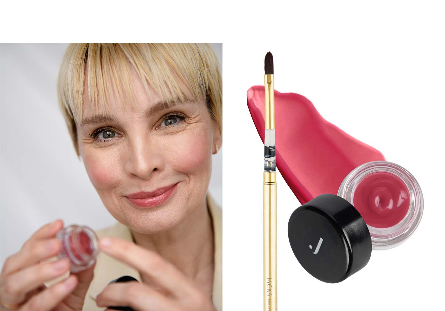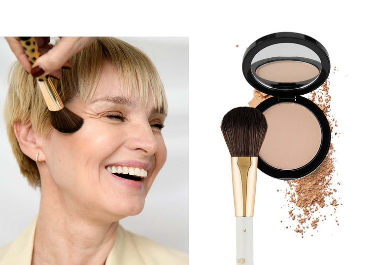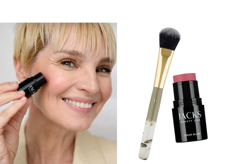 Lächle und trage unseren Cream Blush auf den höchsten Punkt deiner Wangen auf und verblende ihn mit unserem #11 Mini Foundationpinsel.