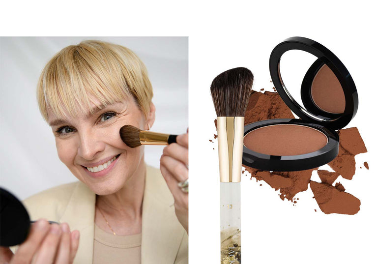 Für den “wie frisch aus dem Urlaub” Effekt sorgt unser Bronzer, der deiner Haut eine natürliche Bräune verleiht. Setze deinen Pinsel #13 außen auf deinem Wangenknochen an und führe ihn nach Innen, entlang der Gesichtskontur. Anschließend gründlich ausblenden.